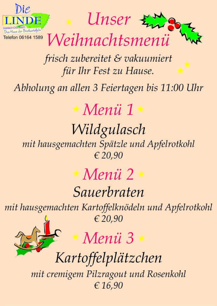 Weihnachten stressfrei zu Hause. Veröffentlicht am November 26, 2025 von Bettina Dingeldein Genießen Sie an allen Feiertagen unsere festlichen Gerichte – liebevoll gekocht, schonend vakuumiert und bereit zum einfachen Aufwärmen. Abholung an allen drei Feiertagen bis 11 Uhr.